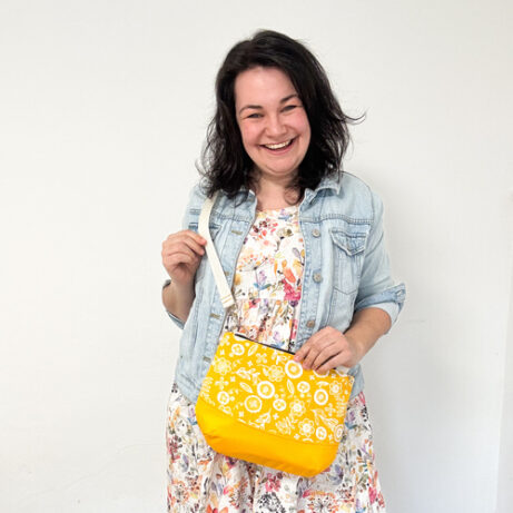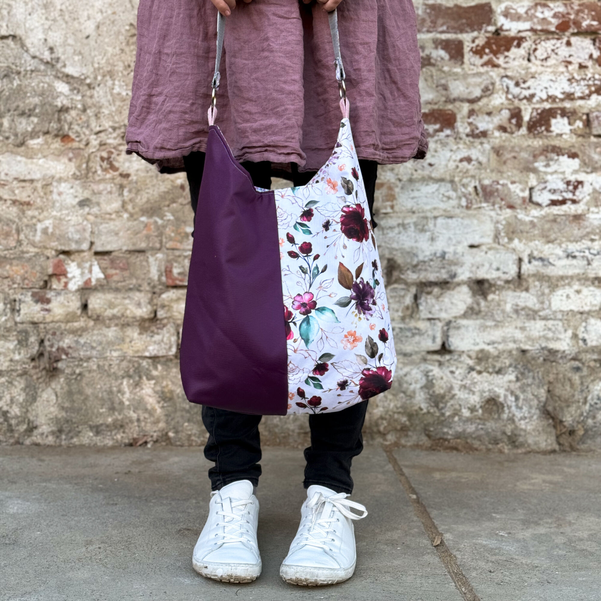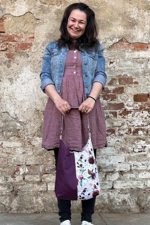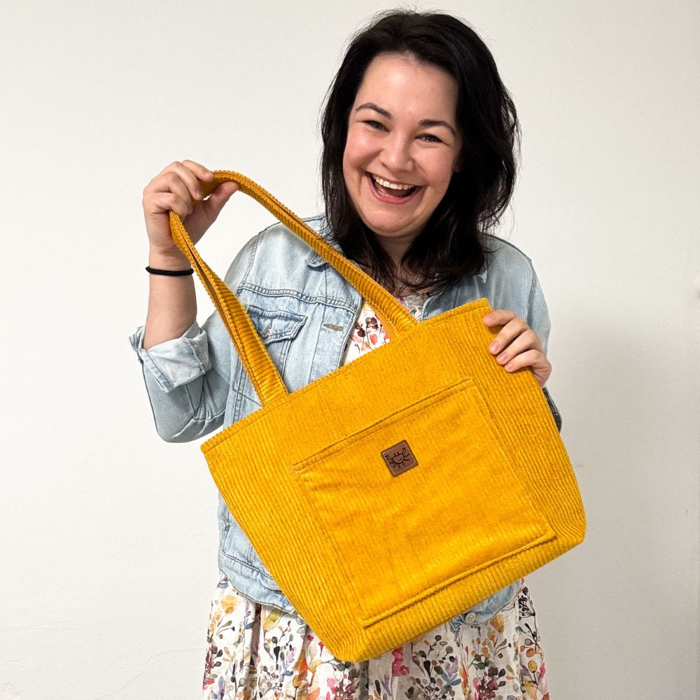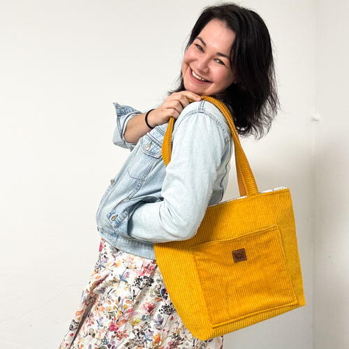 Prostornější kabelka se hodí, pokud sebou nosíš hodně věcí 🙂 (pojme menší počítač, A4 nebo termosku s kafem), dobře se šije i začátečníkům a na kapsách se můžeš kreativně vyřádit