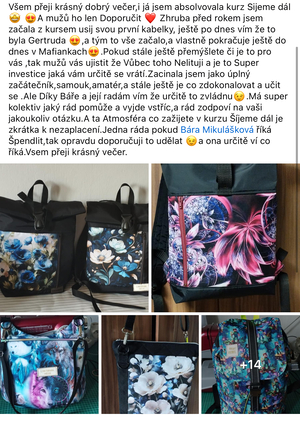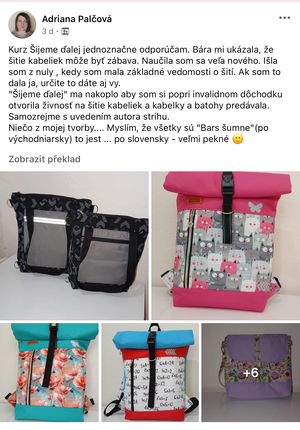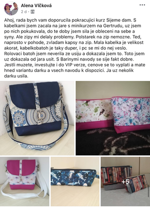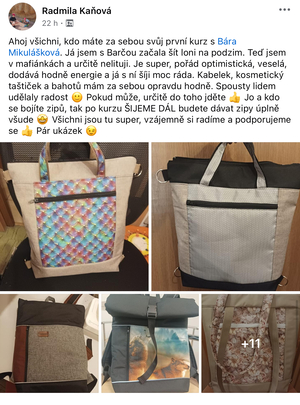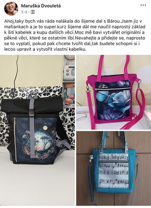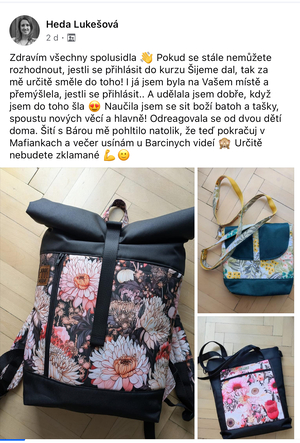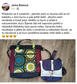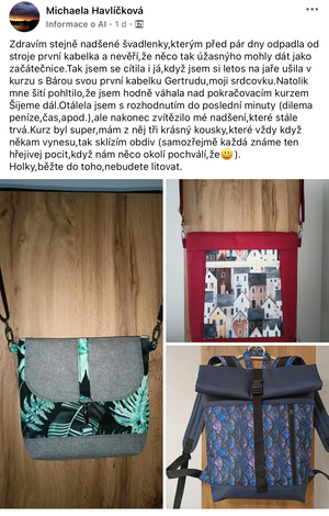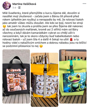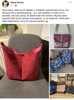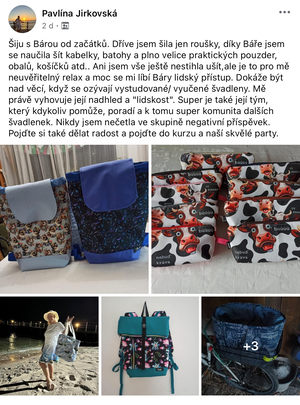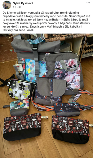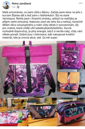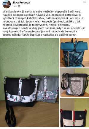Díky tomu, že jsem začala šít kabelky jsem se přestala bát šicího stroje. Začala jsem nedávno šít i jiné věci než kabelky a batohy. Koupila si i overlock. Nebojím se střihnout do látky. Bářiny kurzy jsou komplexní a naučily mě nejen samotné šití, ale spoustu věcí kolem. A taky teda kabelky a batohy zabírají čím dál tím víc místa v ložnici. Mám vyšší sebevědomí co se tyče šití, a mám krásný pocit z každého nového ušitého kousku.