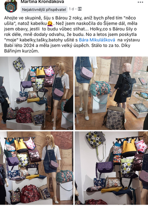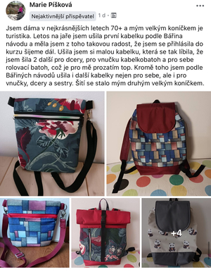 Kurz mi pomohl hodně. Náhle mi na covid odešel jeden z mých nejbližších. Po sedmileté onkologické léčbě mi vlivem osteoporózy došlo ke zlomenině páteře. Pracovní dobu mi snížili na polovinu. Pracovní kolektiv se během pár měsíců zcela vyměnil. Rozvinul se u mě syndrom vyhoření. Šitím jsem získala pocit, že mohu být někomu užitečná. Moje děti i vnoučata mají vše, co potřebují, ovšem kabelky, batůžky a oblečení přesně podle jejich přání je potěší. Cítím se mnohem líp.