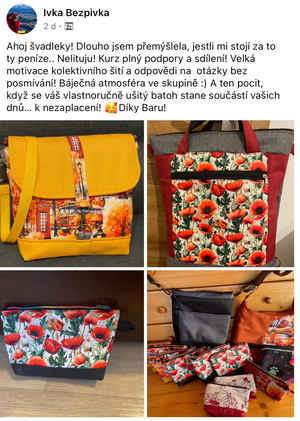 ve speciální FB skupině se budeme s ostatními kurzistkami pravidelně potkávat, inspirovat se ušitými kabelkami, odpovídat na všechny otázky a motivovat tě, když se ti do šití zrovna nebude chtít. Kurz probíhá od 6.4. do 31.5.2026