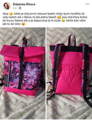 Přesně ten, co je teď tak trendy. Přesně ten, co nosí i puberťáci nebo chlapi do práce. Unosíš ho do města, do školy, na výletech. Takovej batoh je prostě univerzální napříč generacemi nebo prostředím. Materiál si už dokážeš zvolit sama tak, aby přesně vyhovoval tvým požadavkům a limitům tvého stroje.